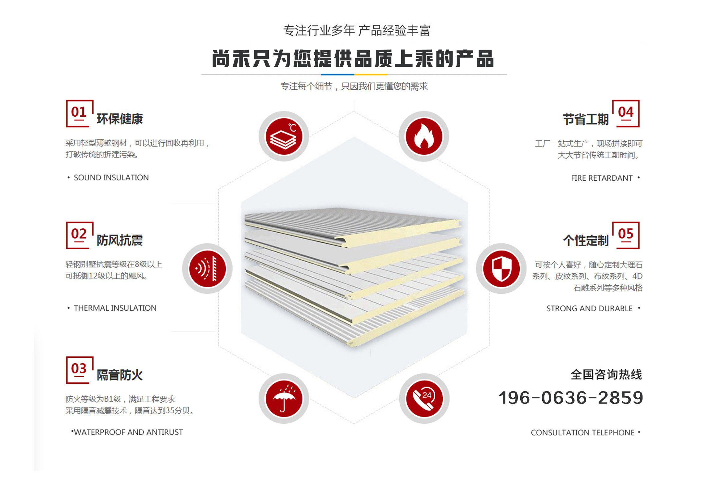 山東尚禾經貿有限公司是集板材設計、研發、生產、施工、一體化的科技公司,并在同行業中率先通過了質量、環境、安全管理體系認證。公司2011年投入資金2000余萬元引進世界先進的聚氨酯節能板連續生產線、意大利進口發泡系統,采用六組份在線自動操作混合澆注技術,在線一次性完成社會配料中心或工廠的配比混合工藝,并可以根據溫度在線自動調整,從而生產處與眾不同的高強度、節能型、綠色環保的聚氨酯夾芯板。(其使用年限高于同行業其他品牌5-10年)  公司主要經營范圍包括聚氨酯夾芯板,PU夾芯板,冷庫板,潔凈板,聚氨酯冷庫板,冷庫保溫板的設計、生產、銷售、技術指導、安裝及一體、以及進出口業務,是中部六省最大的綠色節能建材生產基地。聚氨酯夾芯板年產200萬平方米、PU夾芯板、冷庫保溫板500萬平方米、鏈整產業綜合實力,開創了六省至中西部創新型中小名企總部基地,并將著力推進中國中西部地區集成房屋住宅產業化發展進程。  科技創新、節能典范。千萬間始終秉承“誠信、合作”的企業文化精髓,長期致力于鋼板材結構節能建筑產業,愿與社會各界攜手合作,共鑄綠色、環保美好未來。 產品具有良好的絕熱、阻燃、隔音、環保、耐久性能,可廣泛應用于工業、商用建筑內外墻、以及民用建筑外墻保溫、空調通風系統、專用防火保溫門等領域?! ∥覀兪冀K秉承...